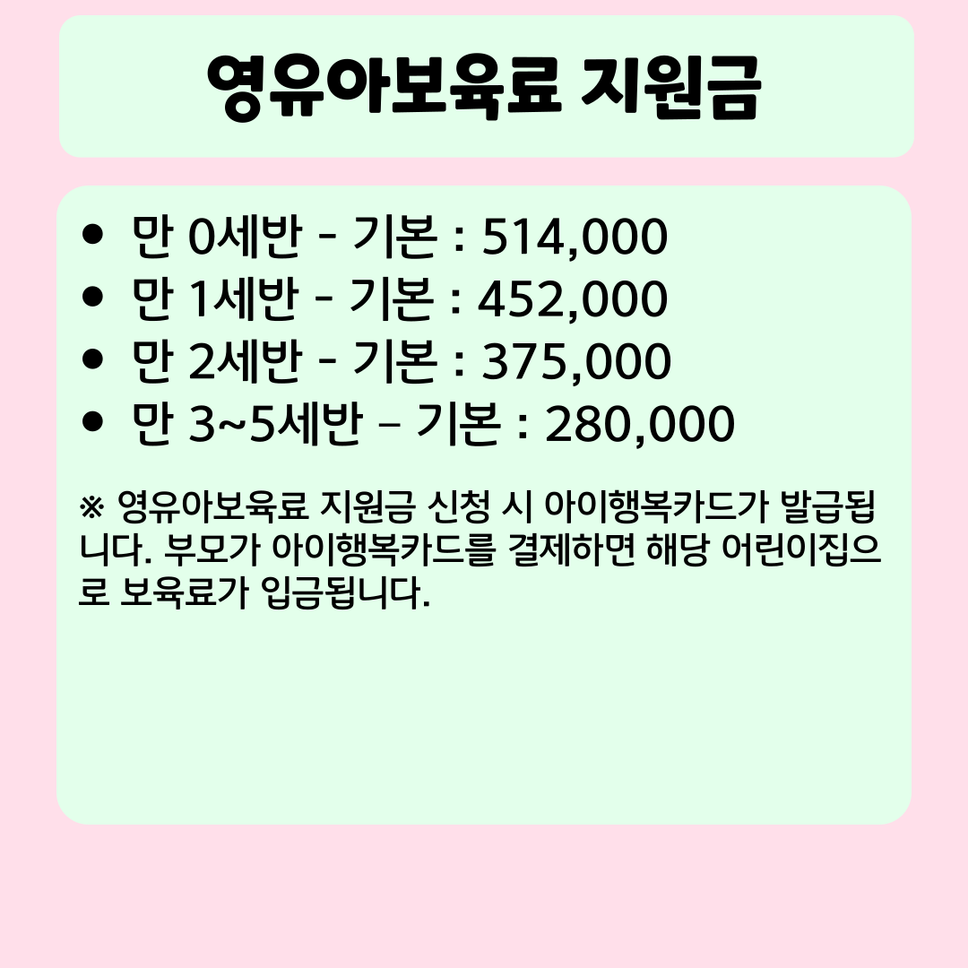 영유아보육료 지원금 신청 시 아이행복카드가 발급됩니다. 부모가 아이행복카드를 결제하면 해당 어린이집으로 보육료가 입금됩니다.