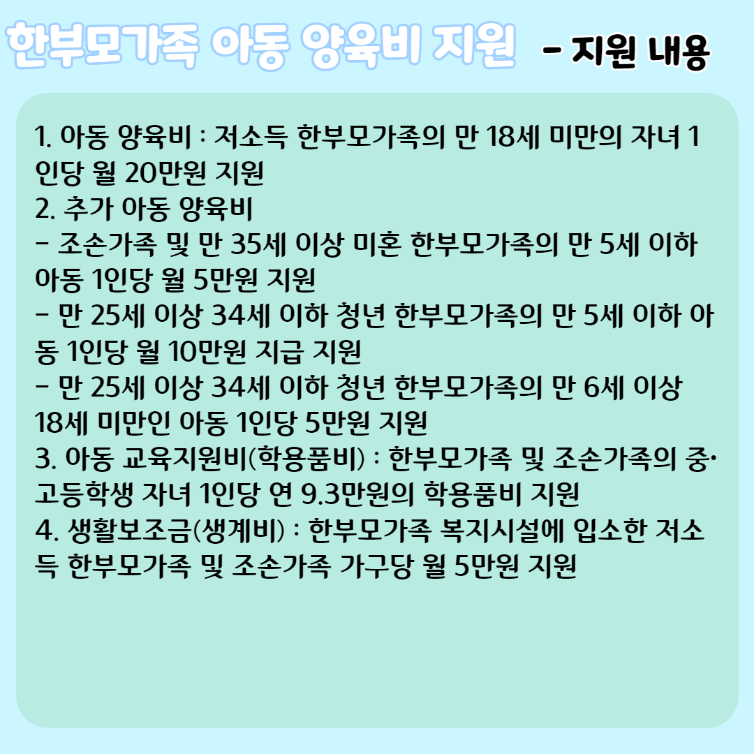 1. 아동 양육비 : 저소득 한부모가족의 만 18세 미만의 자녀 1인당 월 20만원 지원