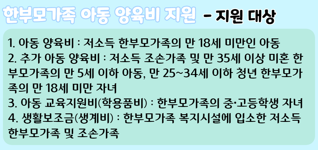2. 추가 아동 양육비 : 저소득 조손가족 및 만 35세 이상 미혼 한부모가족의 만 5세 이하 아동, 만 25~34세 이하 청년 한부모가족의 만 18세 미만 자녀
