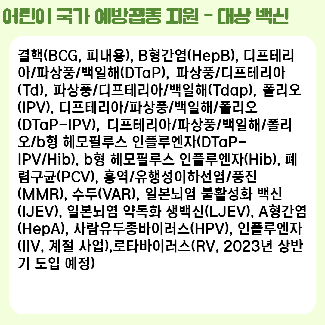 결핵(BCG, 피내용), B형간염(HepB), 디프테리아/파상풍/백일해(DTaP), 파상풍/디프테리아(Td), 파상풍/디프테리아/백일해(Tdap), 폴리오(IPV), 디프테리아/파상풍/백일해/폴리오(DTaP-IPV), 디프테리아/파상풍/백일해/폴리오/b형 헤모필루스 인플루엔자(DTaP-IPV/Hib), b형 헤모필루스 인플루엔자(Hib), 폐렴구균(PCV), 홍역/유행성이하선염/풍진(MMR), 수두(VAR), 일본뇌염 불활성화 백신(IJEV), 일본뇌염 약독화 생백신(LJEV), A형간염(HepA), 사람유두종바이러스(HPV), 인플루엔자(IIV, 계절 사업),로타바이러스(RV, 2023년 상반기 도입 예정)