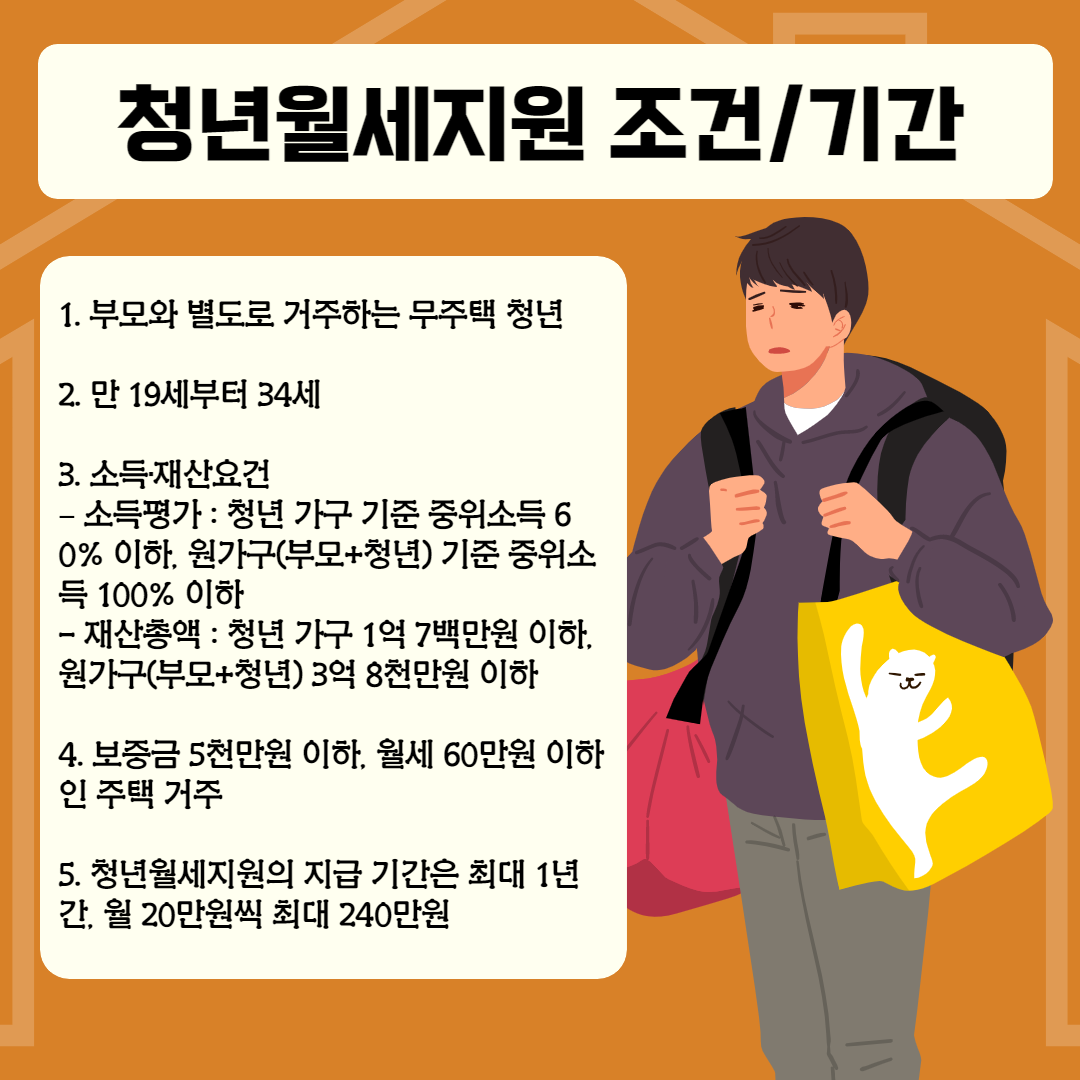 4. 보증금 5천만원 이하이면서 월세 60만원 이하인 주택 거주(전세는 지원 대상이 아니지만 반전세는 보증부월세로 인정되기에 지원 가능. 하숙집, 대학·회사 기숙사, 연세, 사글세 형태의 임대차계약도 지원 가능).