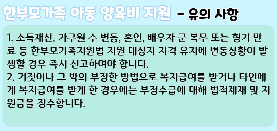 1. 소득재산, 가구원 수 변동, 혼인, 배우자 군 복무 또는 형기 만료 등 한부모가족지원법 지원 대상자 자격 유지에 변동상황이 발생할 경우 즉시 신고하여야 합니다.