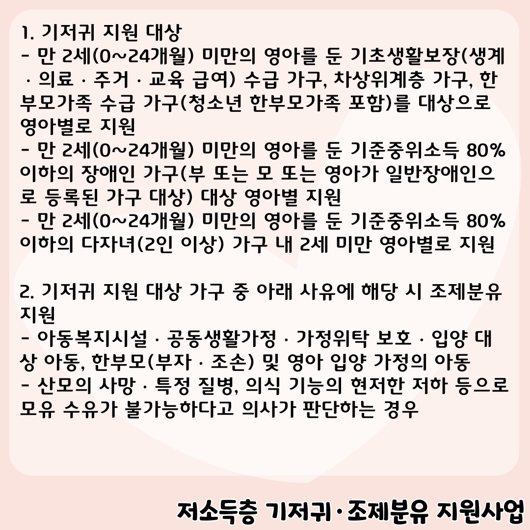 - 만 2세(0~24개월) 미만의 영아를 둔 기초생활보장(생계·의료·주거·교육 급여) 수급 가구, 차상위계층 가구, 한부모가족 수급 가구(청소년 한부모가족 포함)를 대상으로 영아별로 지원
