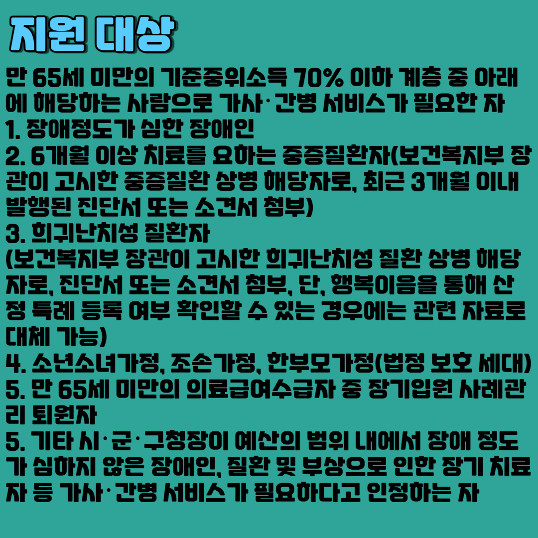 5. 기타 시・군・구청장이 예산의 범위 내에서 장애 정도가 심하지 않은 장애인, 질환 및 부상으로 인한 장기 치료자 등 가사・간병 서비스가 필요하다고 인정하는 자