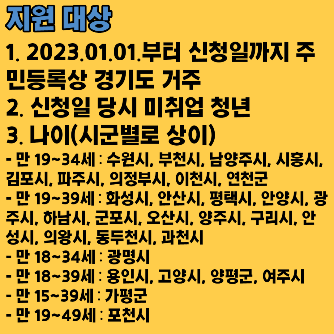 - 만 19~34세 : 수원시, 부천시, 남양주시, 시흥시, 김포시, 파주시, 의정부시, 이천시, 연천군