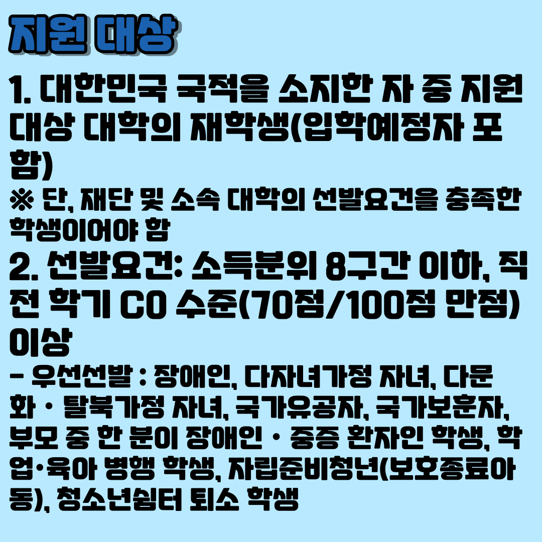 1. 대한민국 국적을 소지한 자 중 지원 대상 대학의 재학생(입학예정자 포함)