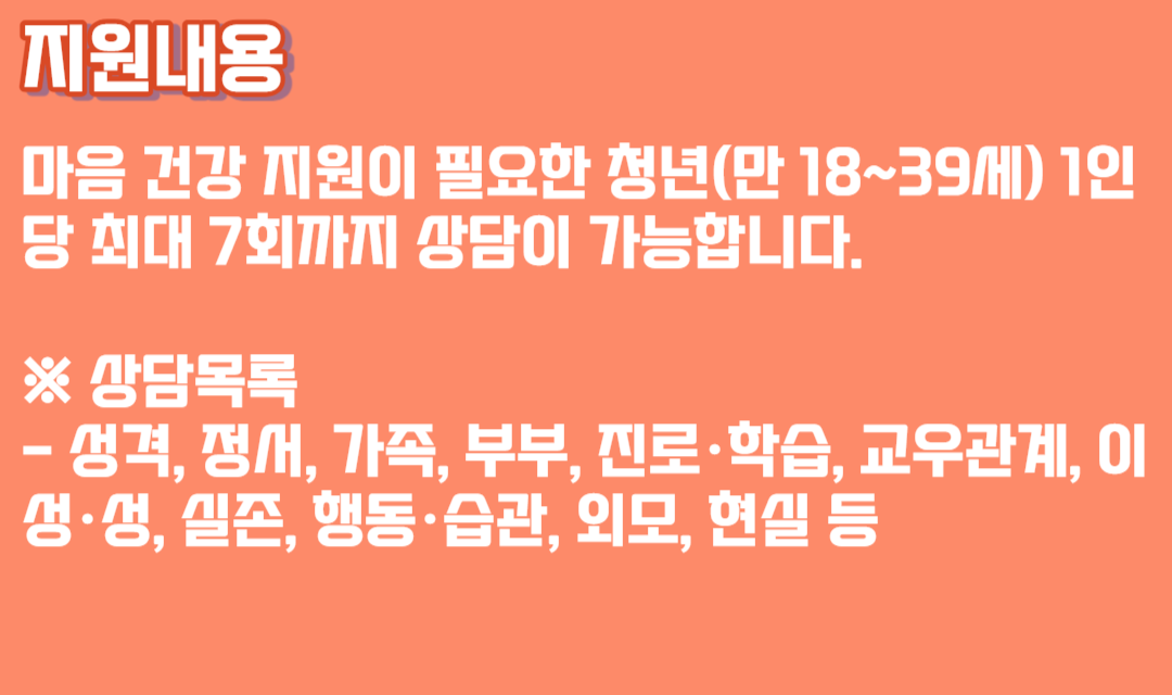 마음 건강 지원이 필요한 청년(만 18~39세) 1인당 최대 7회까지 상담이 가능합니다.