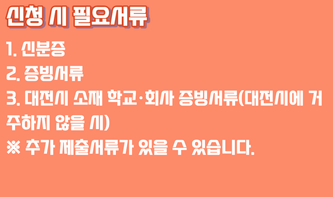 ※ 신청일 기준 주소지가 대전시가 아니더라도, 학교 또는 직장이 대전시인 경우 증빙서류(재학증명서 또는 재직증명서 등) 지참 후 상담소에 방문