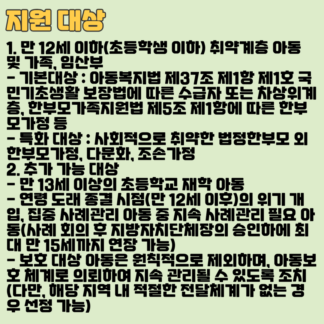 - 연령 도래 종결 시점(만 12세 이후)의 위기 개입, 집중 사례관리 아동 중 지속 사례관리 필요 아동(사례 회의 후 지방자치단체장의 승인하에 최대 만 15세까지 연장 가능)