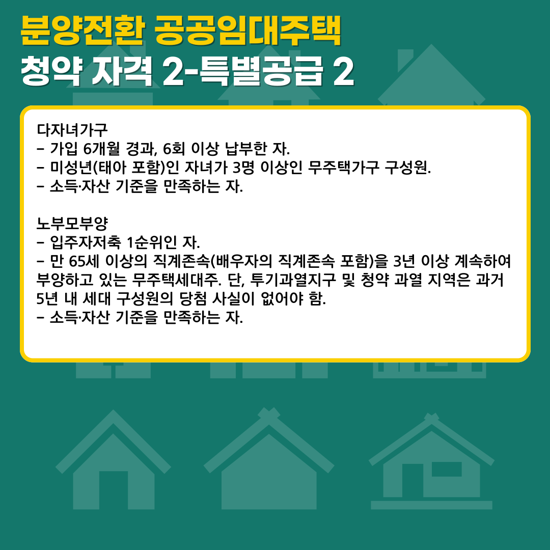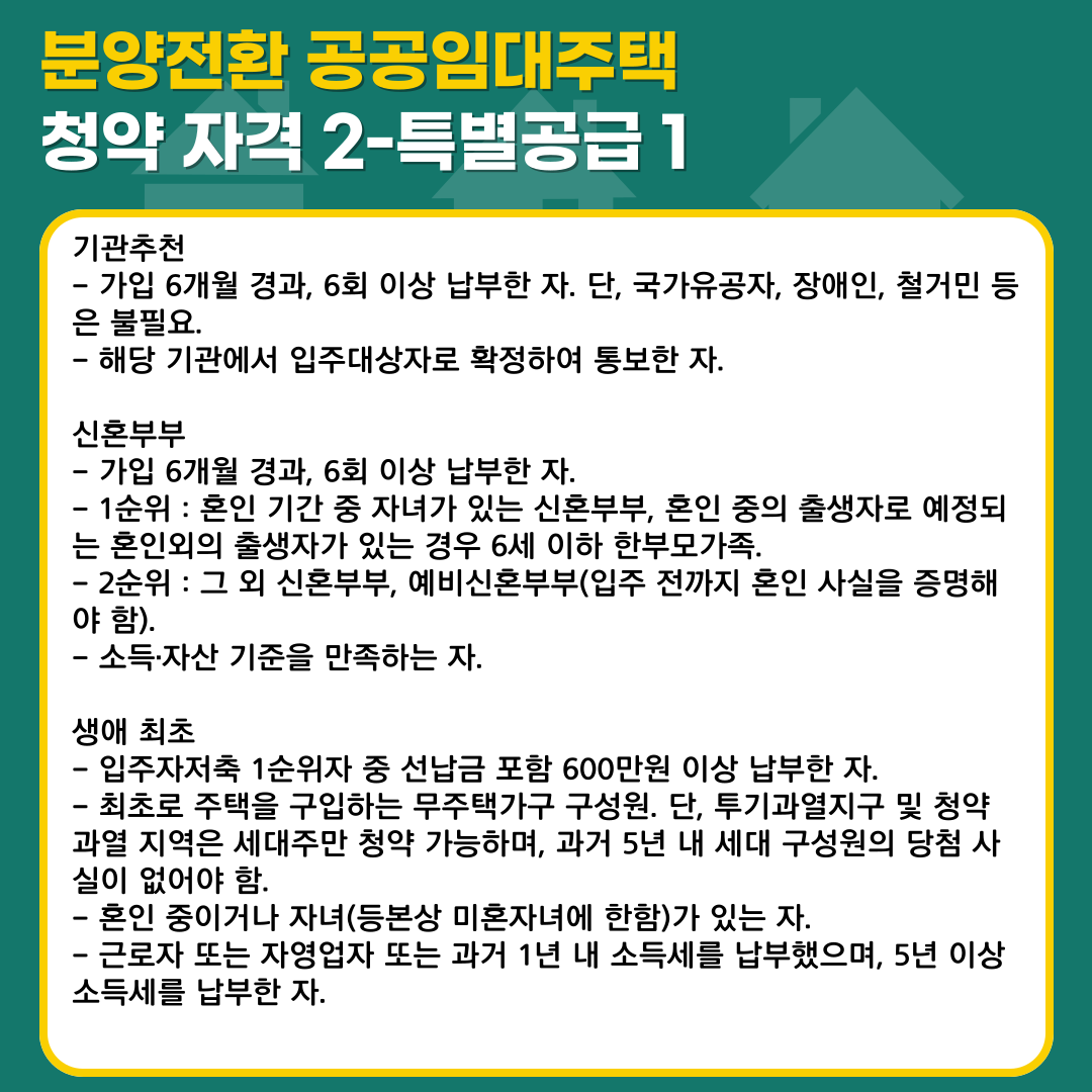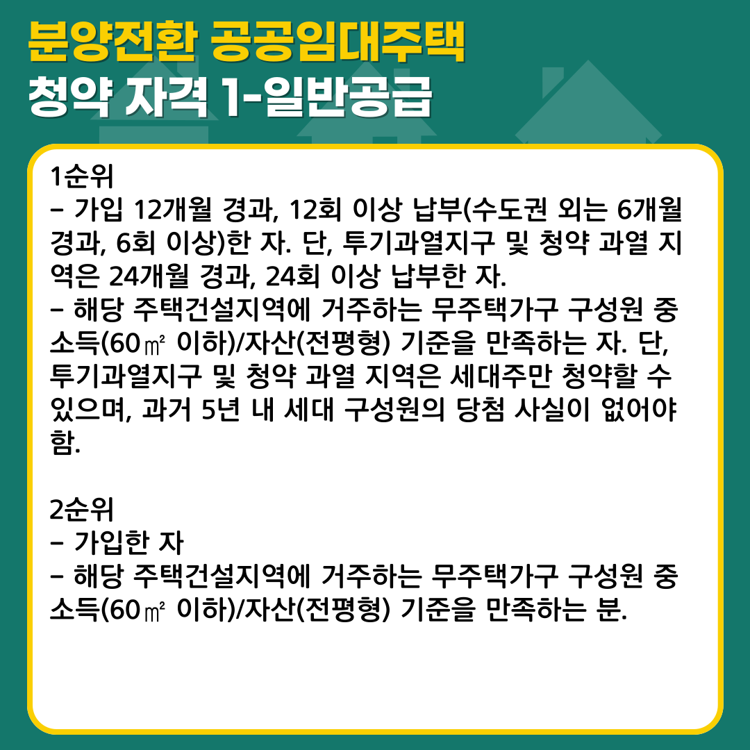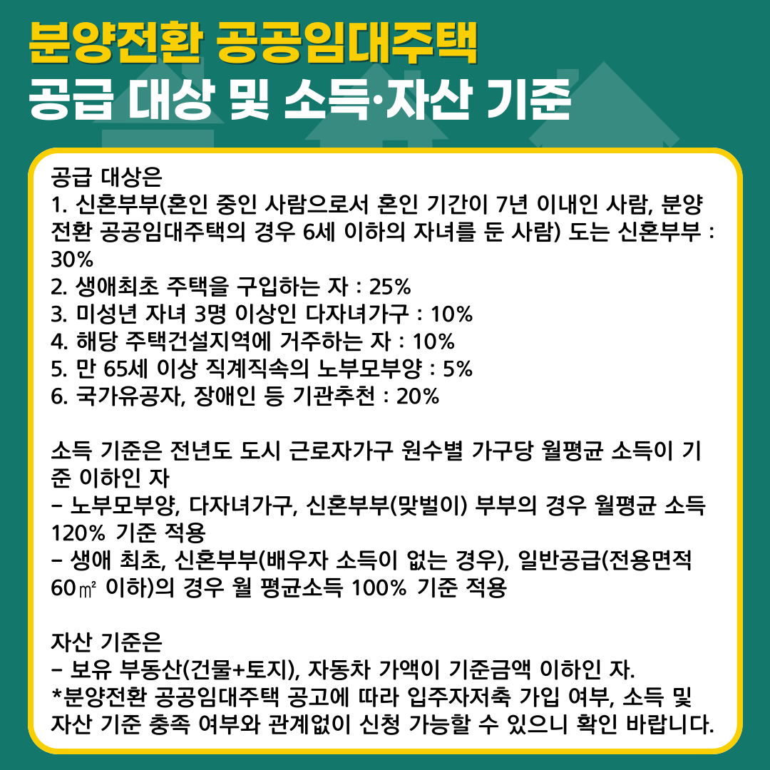 *분양전환 공공임대주택 공고에 따라 입주자저축 가입 여부, 소득 및 자산 기준 충족 여부와 관계없이 신청 가능할 수 있으니 확인 바랍니다.