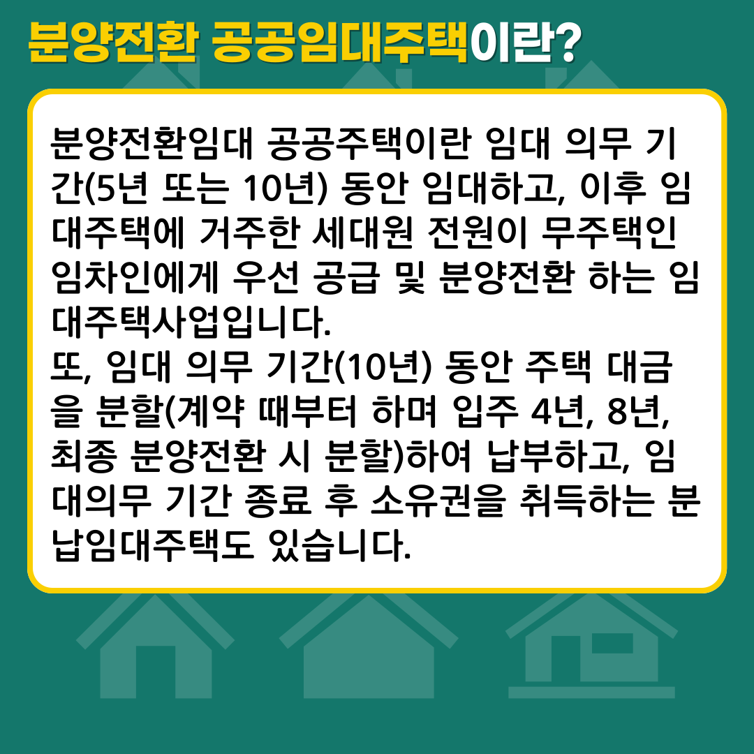 분양전환임대 공공주택이란 임대 의무 기간(5년 또는 10년) 동안 임대하고, 이후 임대주택에 거주한 세대원 전원이 무주택인 임차인에게 우선 공급 및 분양전환 하는 임대주택사업입니다.