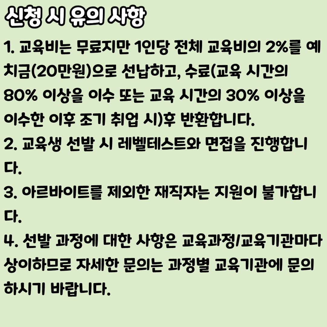 1. 교육비는 무료지만 1인당 전체 교육비의 2%를 예치금(20만원)으로 선납하고, 수료(교육 시간의 80% 이상을 이수 또는 교육 시간의 30% 이상을 이수한 이후 조기 취업 시)후 반환합니다.