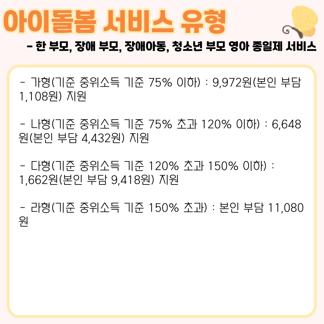 - 가형(기준 중위소득 기준 75% 이하) : A형 9,418원(본인 부담 1,662원) 지원 / B형 8,310원(본인 부담 2,770원) 지원