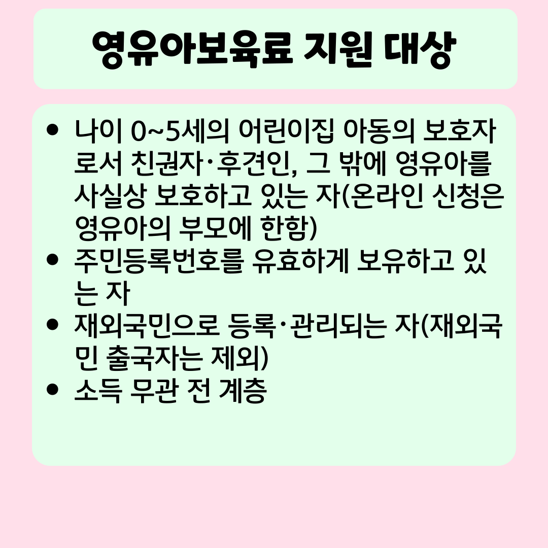 나이 0~5세의 어린이집 아동의 보호자로서 친권자・후견인, 그 밖에 영유아를 사실상 보호하고 있는 자(온라인 신청은 영유아의 부모에 한함)