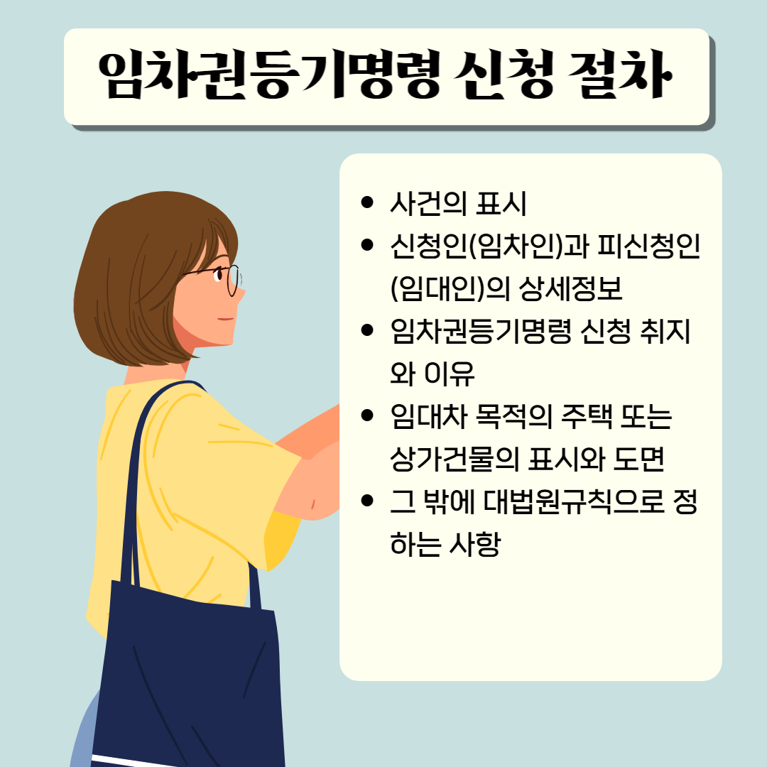임차권등기명령을 신청하는 임차인은 아래의 사항을 기재한 임차권등기명령 신청서를 작성하여 기명날인 또는 서명한 후 관련 첨부서류와 함께 임차 주택의 소재지를 관할하는 지방법원·지방법원지원 또는 시·군 법원에 접수해야 합니다(주택임대차보호법 제3조의3 제1항).