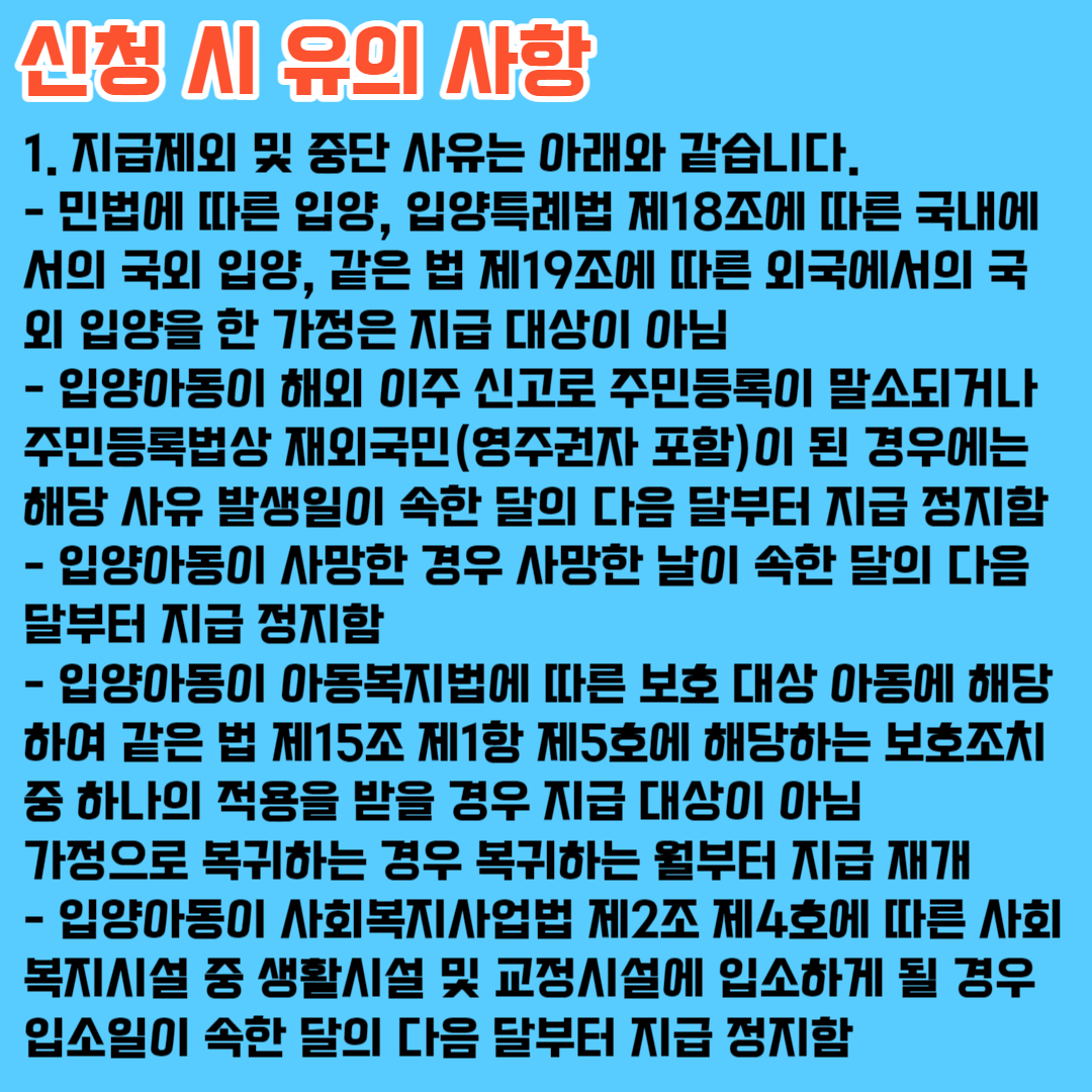 - 입양아동이 해외 이주 신고로 주민등록이 말소되거나 주민등록법상 재외국민(영주권자 포함)이 된 경우에는 해당 사유 발생일이 속한 달의 다음 달부터 지급 정지함