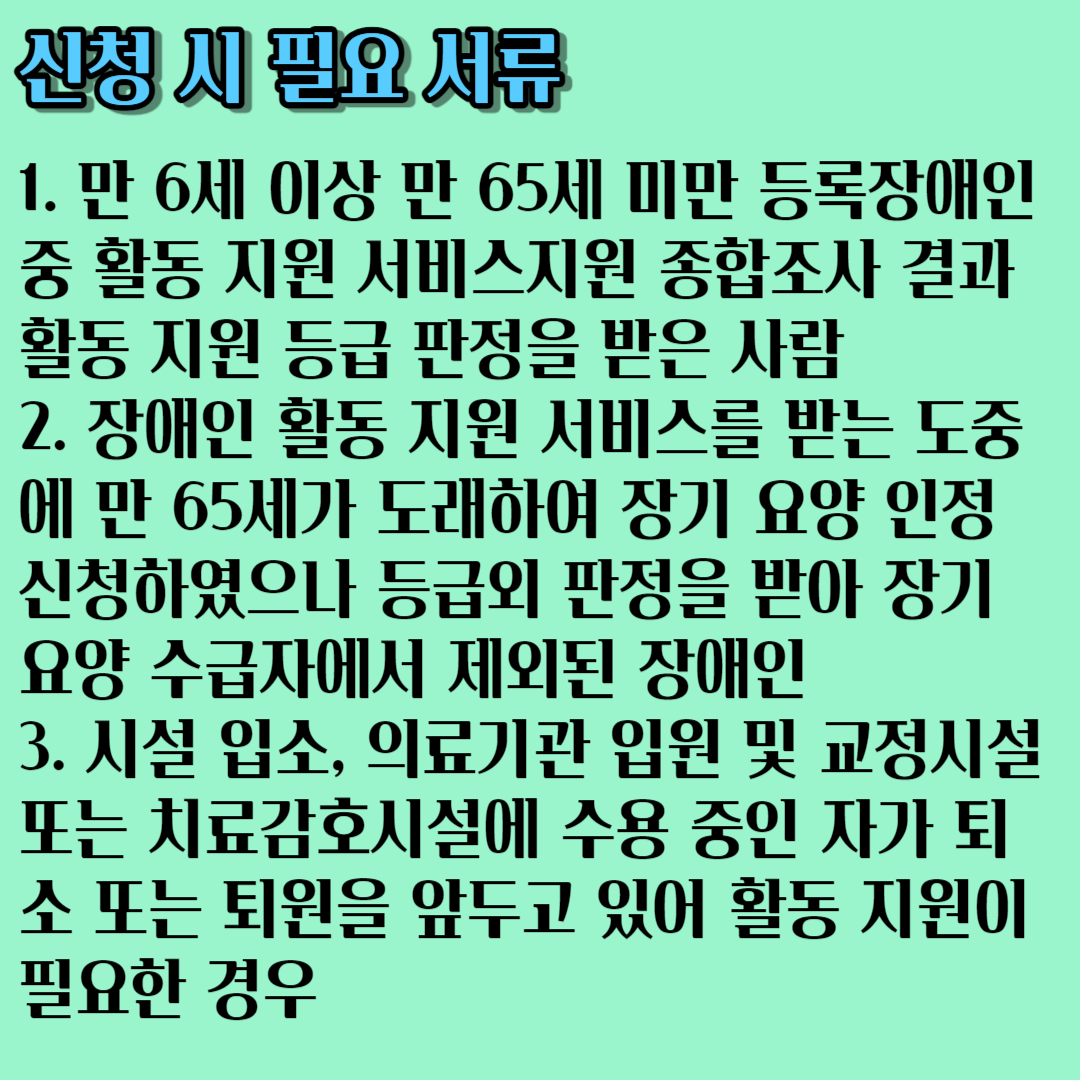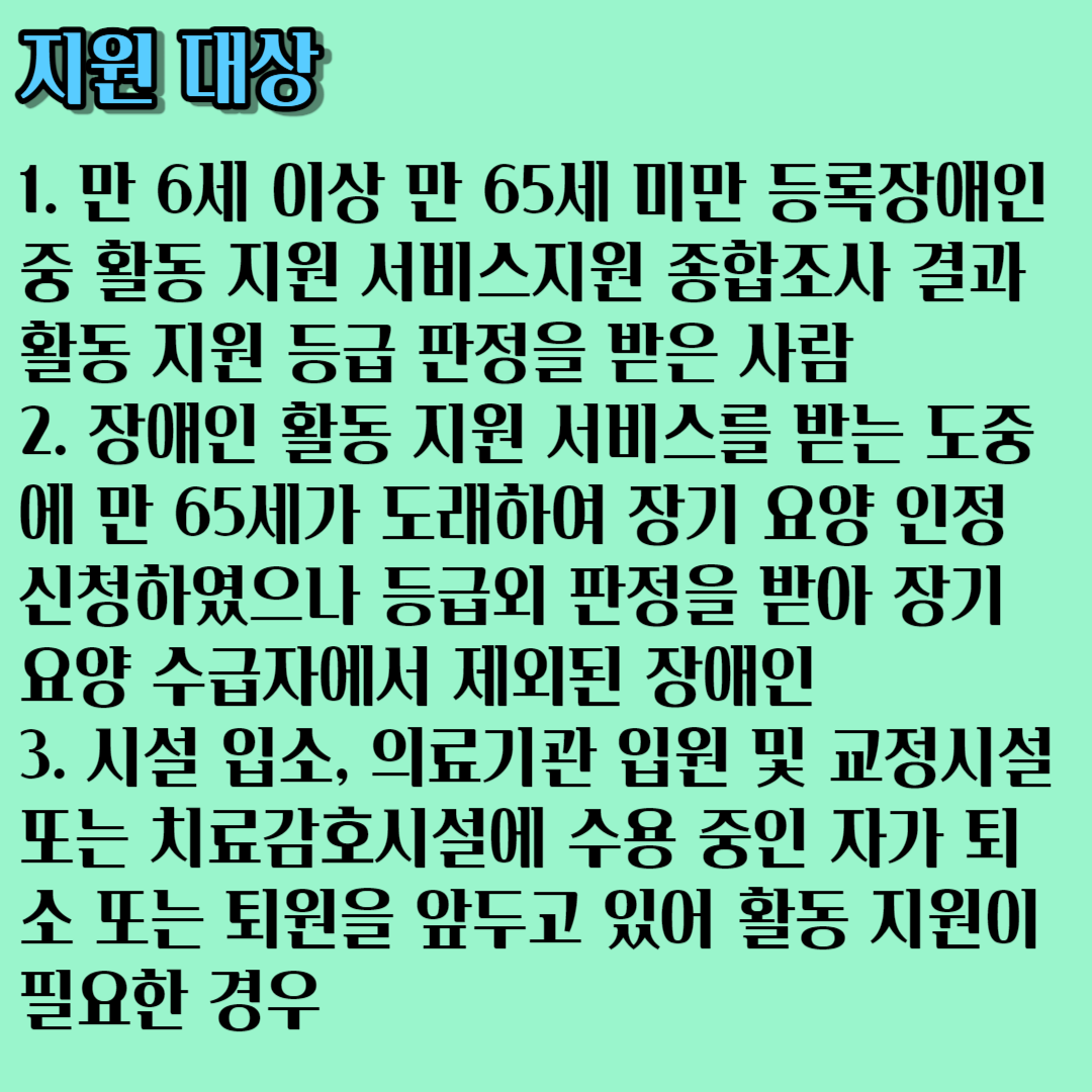 1. 만 6세 이상 만 65세 미만 등록장애인 중 활동 지원 서비스지원 종합조사 결과 활동 지원 등급 판정을 받은 사람