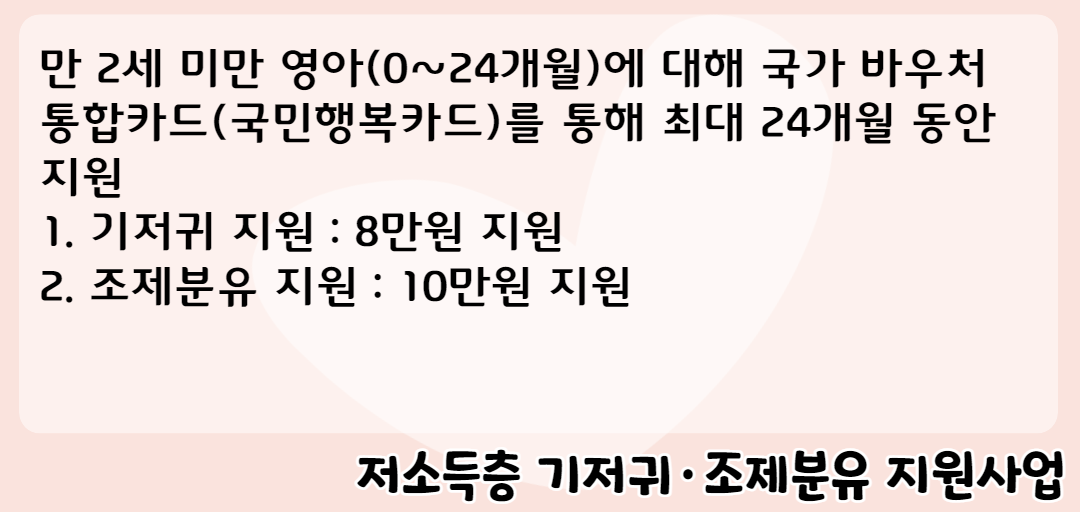 - 만 2세(0~24개월) 미만의 영아를 둔 기초생활보장(생계·의료·주거·교육 급여) 수급 가구, 차상위계층 가구, 한부모가족 수급 가구(청소년 한부모가족 포함)를 대상으로 영아별로 지원