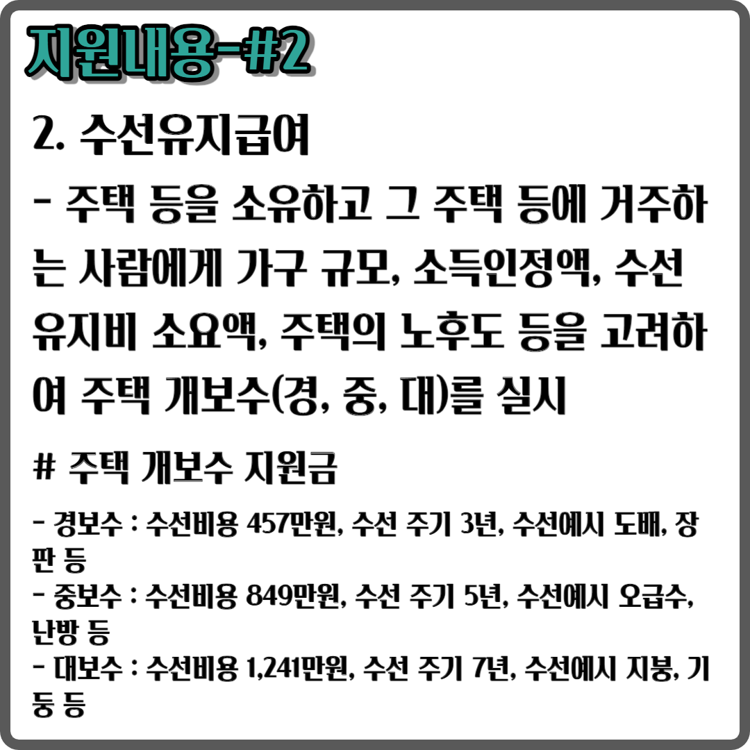 - 주택 등을 소유하고 그 주택 등에 거주하는 사람에게 가구 규모, 소득인정액, 수선유지비 소요액, 주택의 노후도 등을 고려하여 주택 개보수(경, 중, 대)를 실시