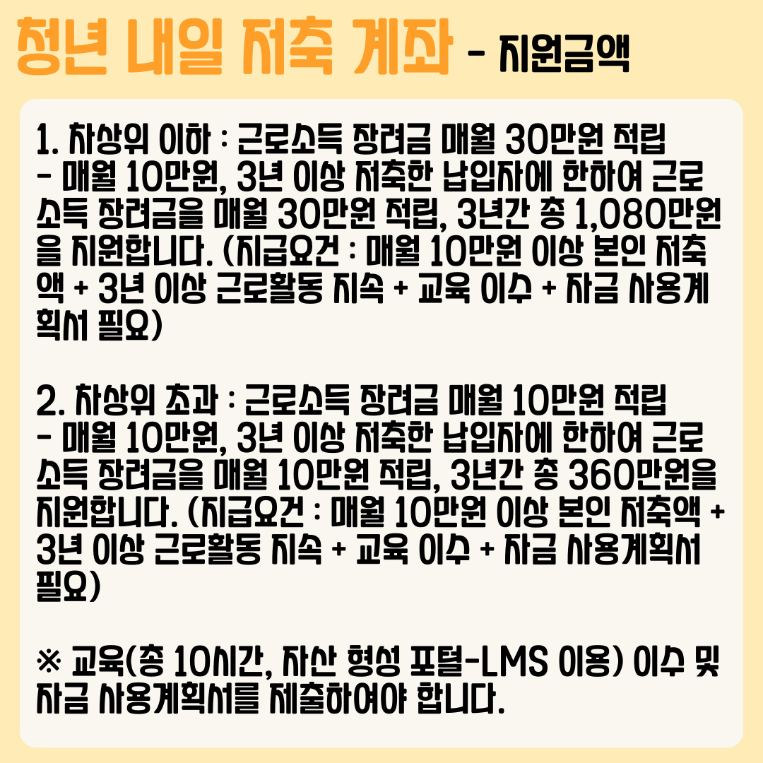 - 매월 10만원, 3년 이상 저축한 납입자에 한하여 근로소득 장려금을 매월 10만원 적립, 3년간 총 360만원을 지원합니다. (지급요건 : 매월 10만원 이상 본인 저축액 + 3년 이상 근로활동 지속 + 교육 이수 + 자금 사용계획서 필요)