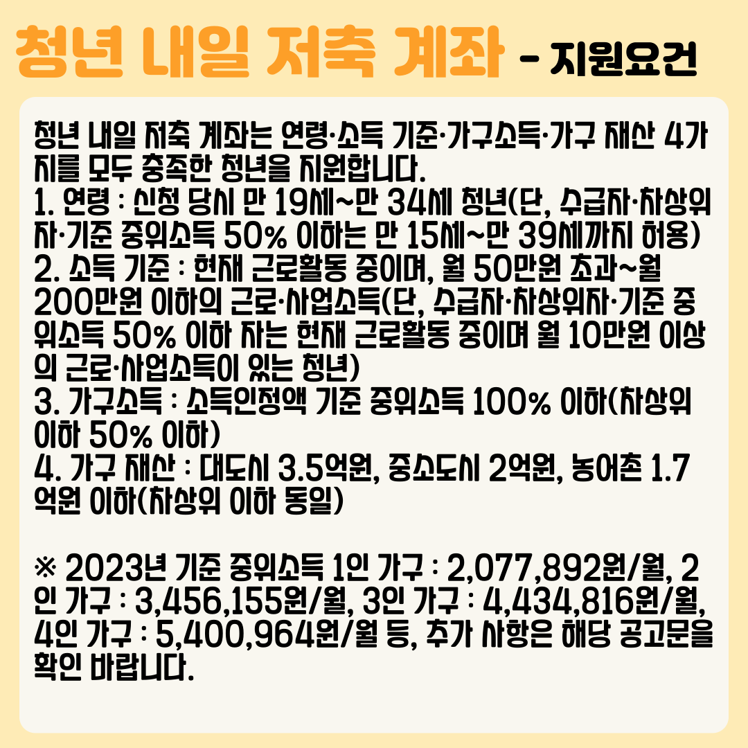 ※ 2023년 기준 중위소득 1인 가구 : 2,077,892원/월, 2인 가구 : 3,456,155원/월, 3인 가구 : 4,434,816원/월, 4인 가구 : 5,400,964원/월 등, 추가 사항은 해당 공고문을 확인 바랍니다.
