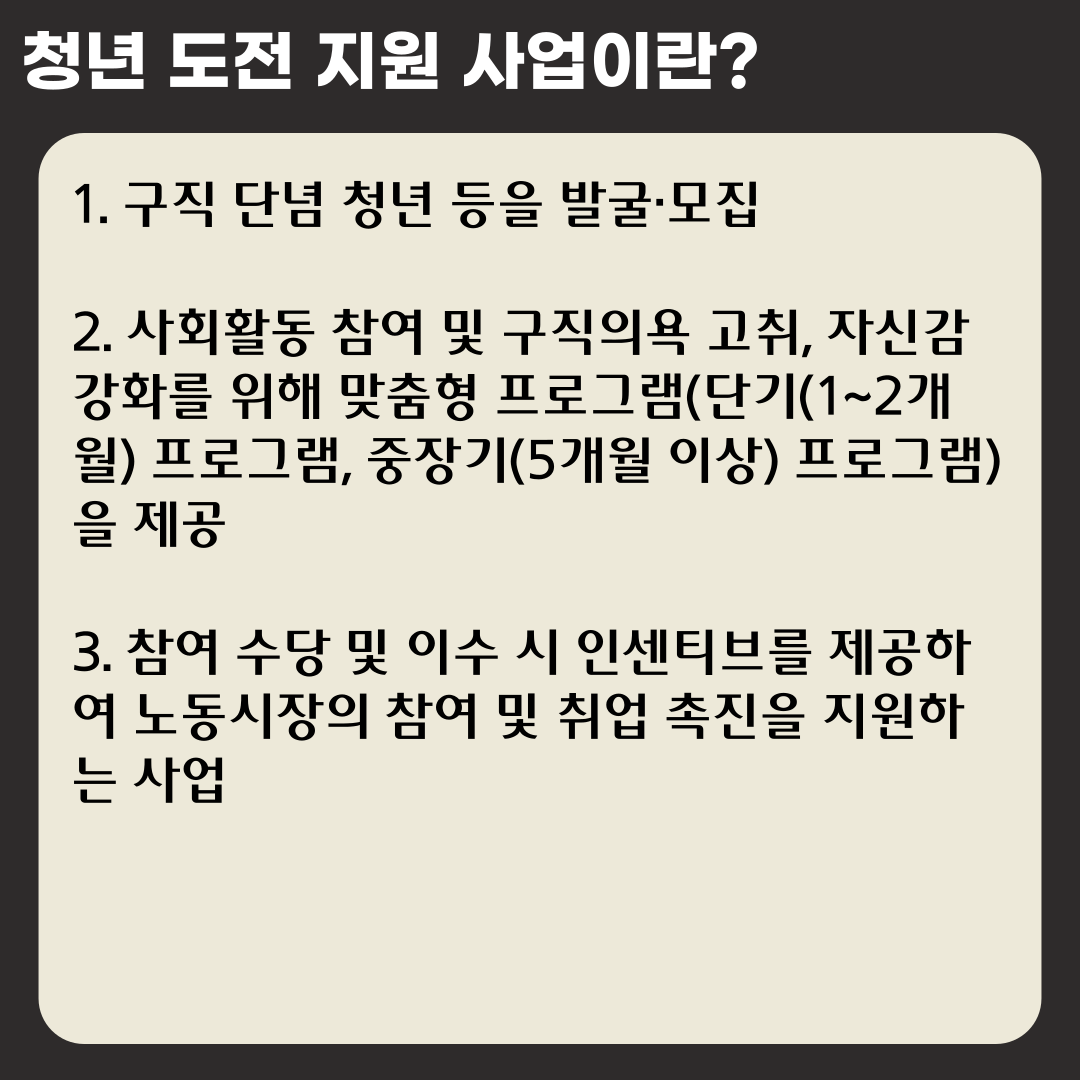 청년 도전 지원 사업이란 구직 단념 청년 등을 발굴·모집하여, 사회활동 참여 및 구직의욕 고취, 자신감 강화를 위해 맞춤형 프로그램(단기(1~2개월) 프로그램, 중장기(5개월 이상) 프로그램)을 제공하며, 참여 수당 및 이수 시 인센티브를 제공하여 노동시장의 참여 및 취업 촉진을 지원하는 사업입니다.