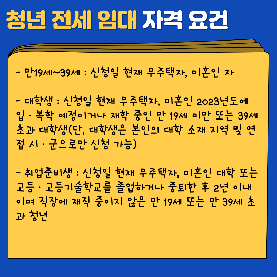 - 대학생 : 신청일 현재 무주택자, 미혼인 2023년도에 입·복학 예정이거나 재학 중인 만 19세 미만 또는 39세 초과 대학생(단, 대학생은 본인의 대학 소재 지역 및 연접 시·군으로만 신청 가능)