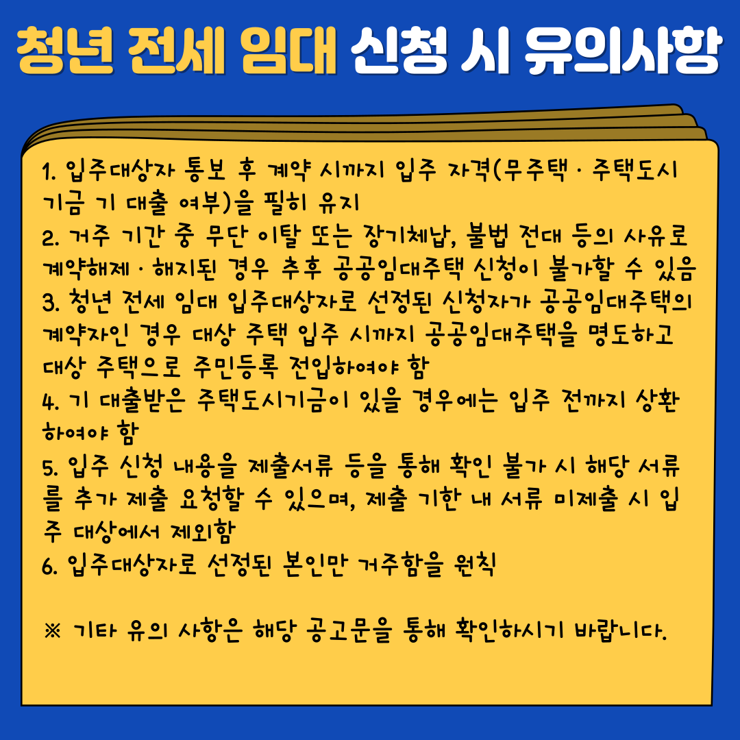 2. 거주 기간 중 무단 이탈 또는 장기체납, 불법 전대 등의 사유로 계약해제·해지된 경우 추후 공공임대주택 신청이 불가할 수 있음