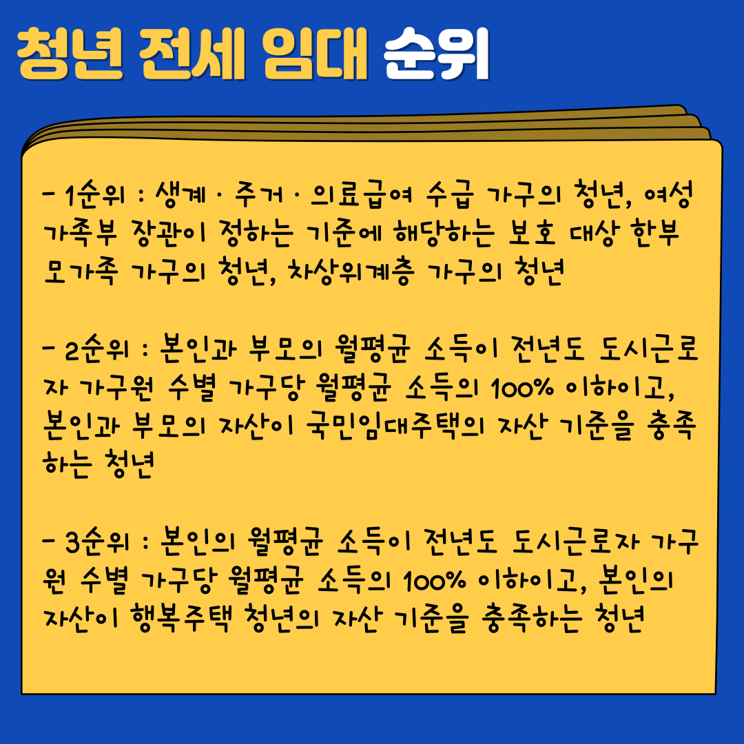 - 1순위 : 생계·주거·의료급여 수급 가구의 청년, 여성가족부 장관이 정하는 기준에 해당하는 보호 대상 한부모가족 가구의 청년, 차상위계층 가구의 청년