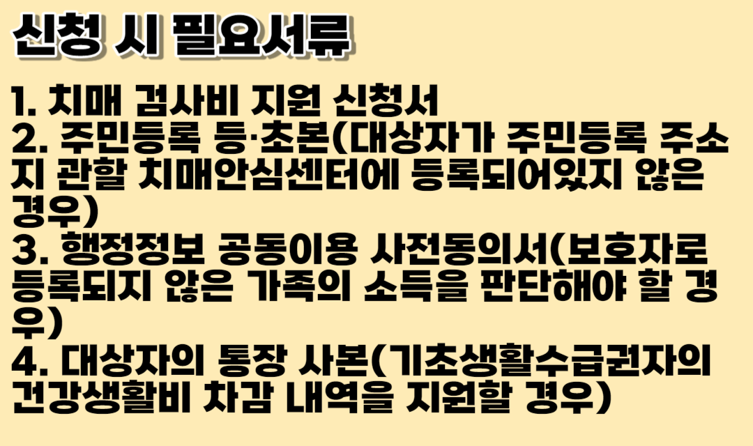 대상자의 주민등록 주소지 관할 치매안심센터(미등록된 대상자여도 가능)에서 검사비를 지원합니다.