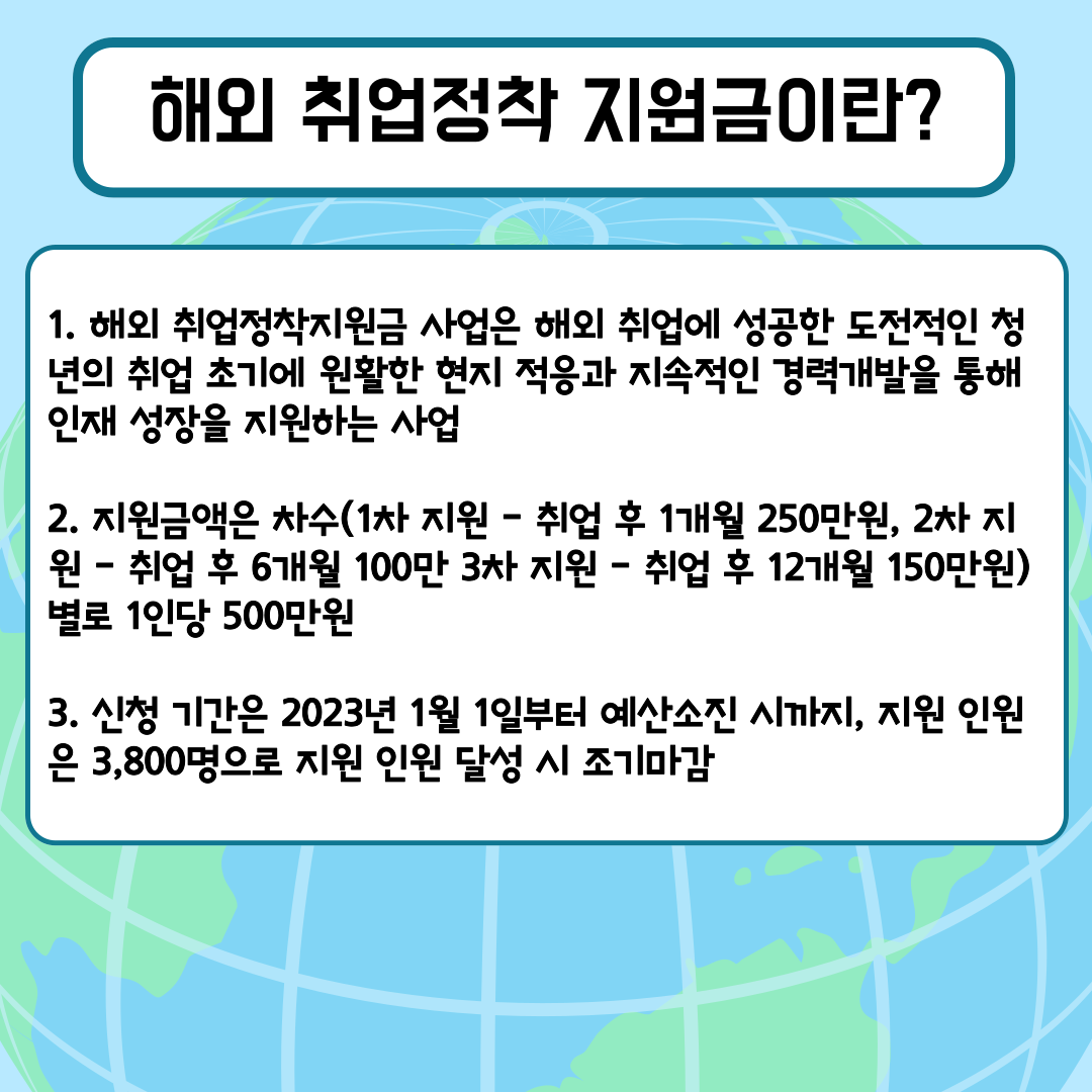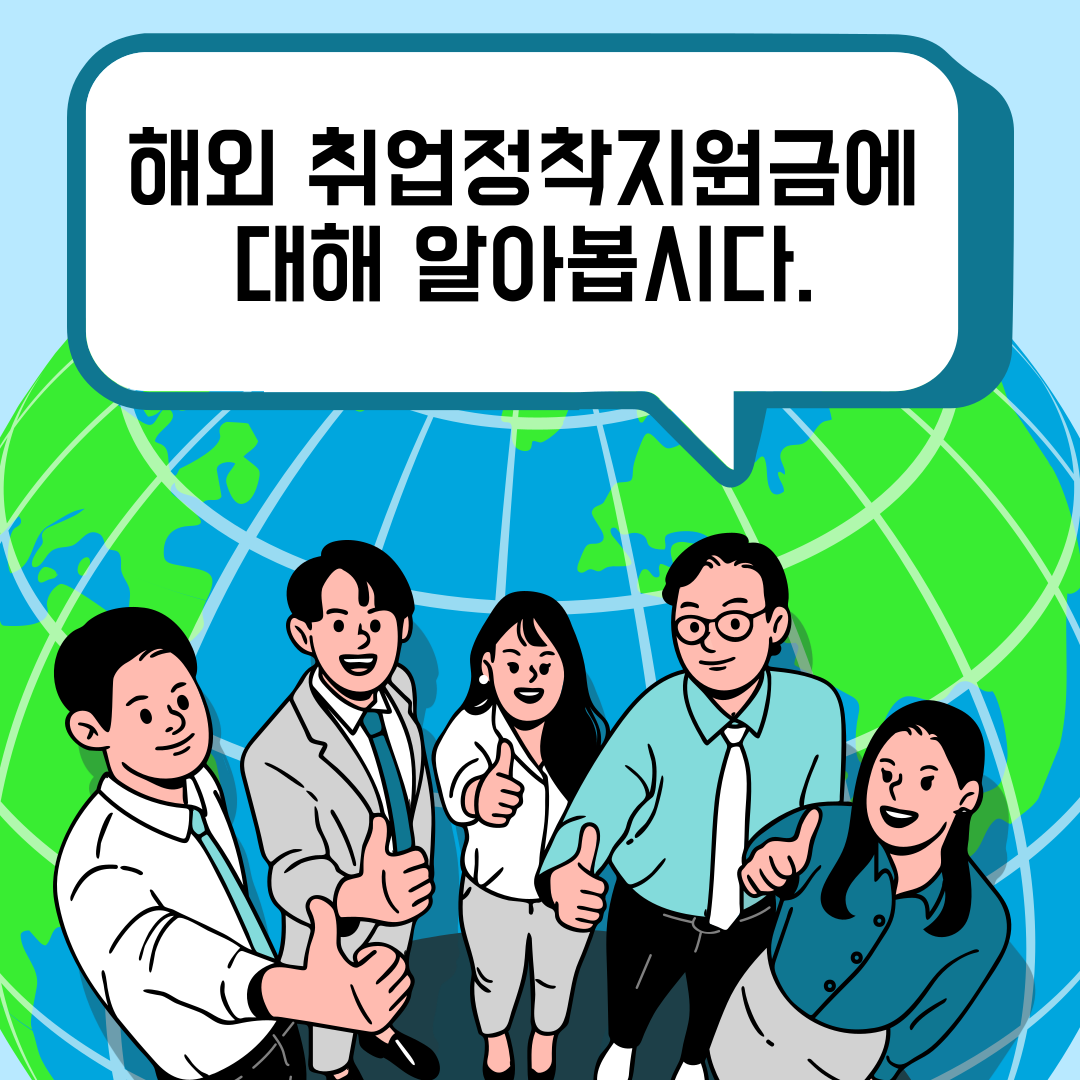 안녕하세요, 오늘은 해외 취업을 도전하는, 또는 해외 취업 초기인 분들을 위한 사업 중 하나인 해외 취업정착지원금에 대해 알아보도록 하겠습니다.