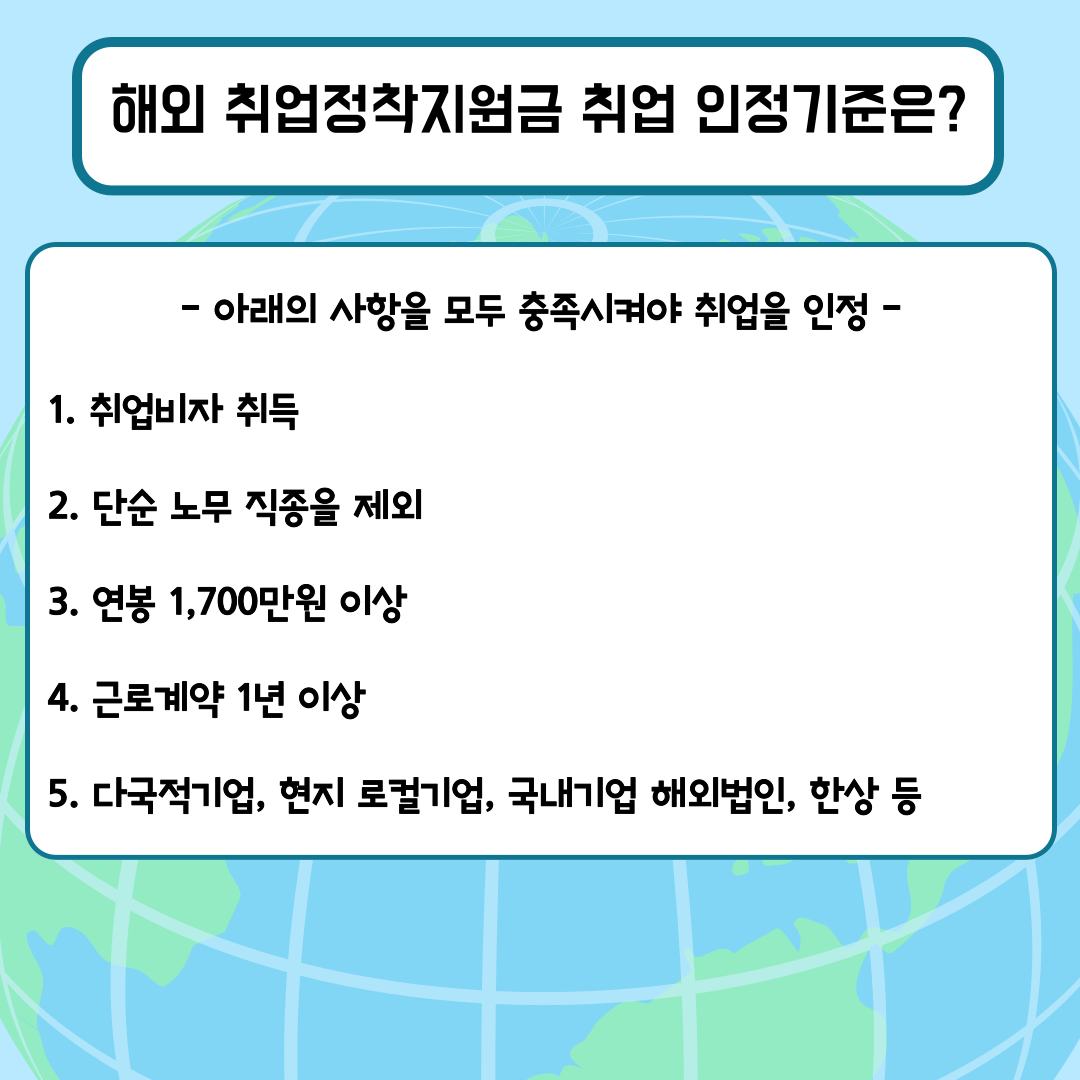 해외 취업정착지원금은 아래의 사항을 모두 충족시켜야 취업을 인정합니다.