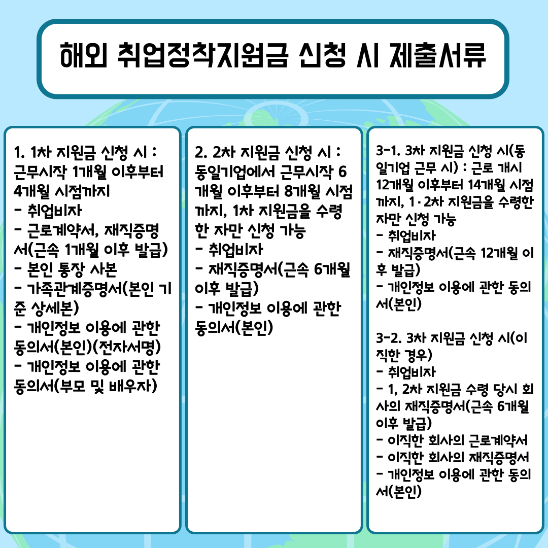 해외 취업정착지원금 사업은 해외 취업에 성공한 도전적인 청년의 취업 초기에 원활한 현지 적응과 지속적인 경력개발을 통해 인재 성장을 지원하는 사업입니다.