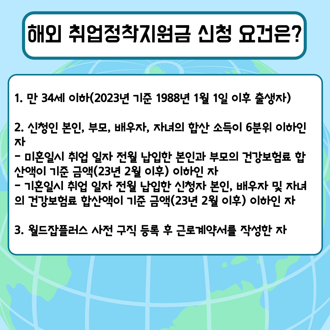 3. 기타 유의 사항 및 지원 제외 대상은 월드플러스잡-해외 취업정착지원금 페이지-공고에서 확인하실 수 있습니다.