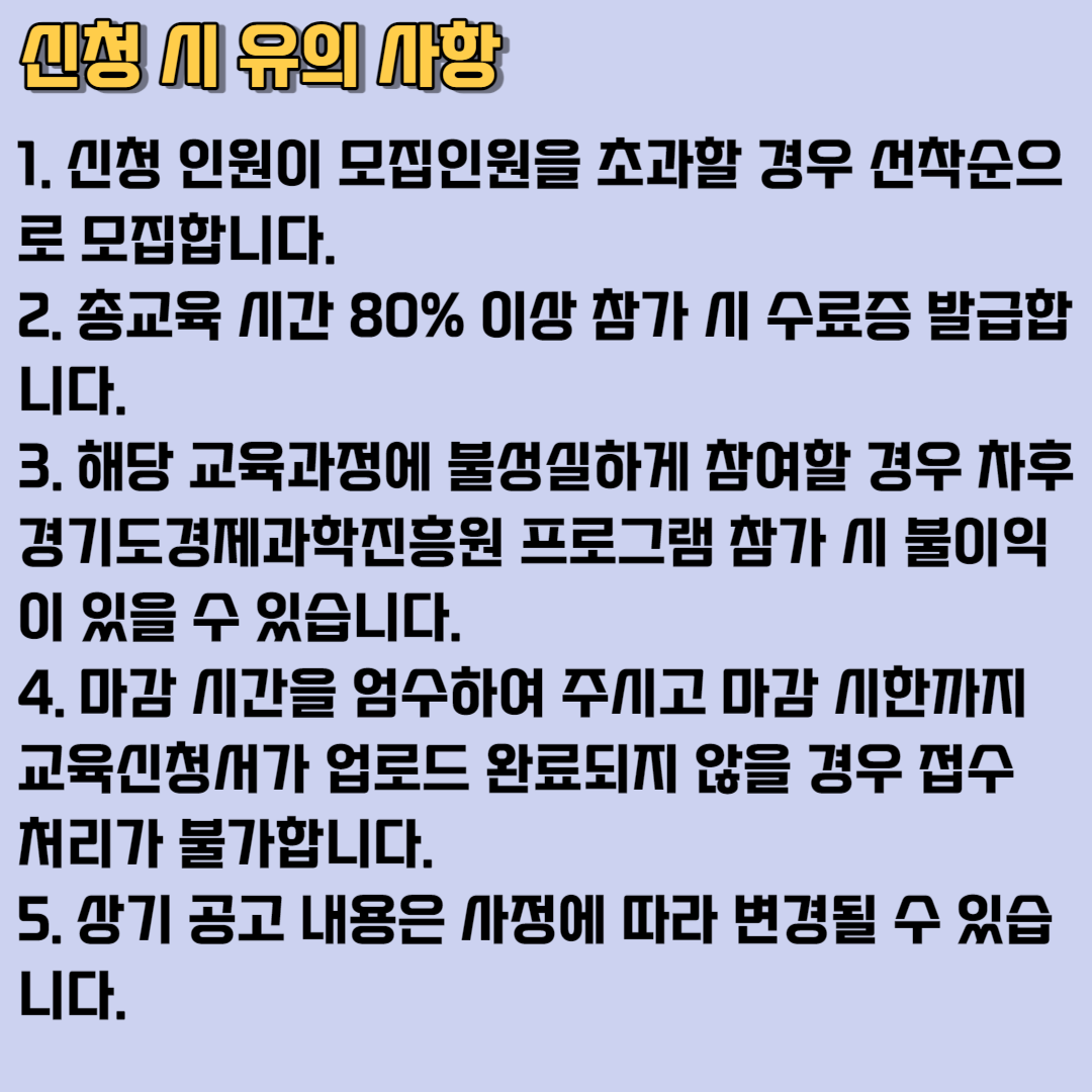 3. 해당 교육과정에 불성실하게 참여할 경우 차후 경기도경제과학진흥원 프로그램 참가 시 불이익이 있을 수 있습니다.