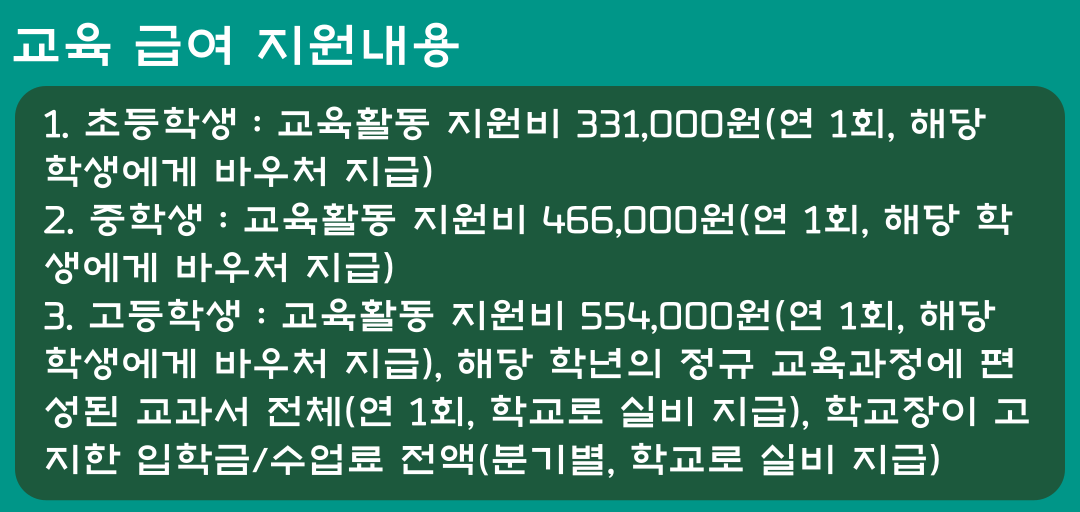 3. 고등학생 : 교육활동 지원비 554,000원(연 1회, 해당 학생에게 바우처 지급), 해당 학년의 정규 교육과정에 편성된 교과서 전체(연 1회, 학교로 실비 지급), 학교장이 고지한 입학금/수업료 전액(분기별, 학교로 실비 지급)