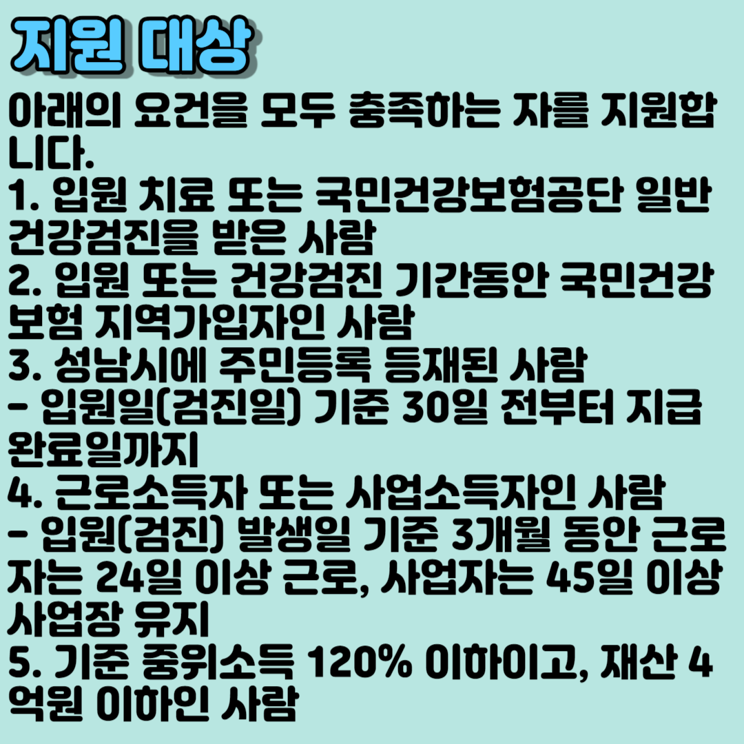 성남시 노동 취약계층 유급병가는 근로소득 또는 사업소득이 있는 시민이 질병 또는 부상으로 의료기관에 입원하거나 건강검진을 필요로 하는 경우 최소한의 생계를 유지할 수 있도록 유급병가(생계비)를 지원하는 지원사업입니다.