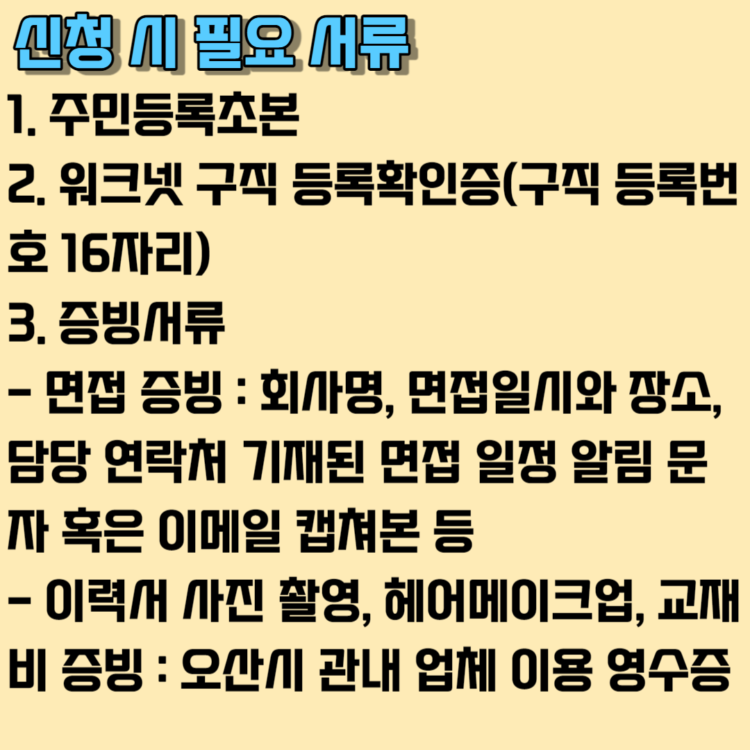 - 이력서 사진 촬영, 헤어메이크업, 교재비 증빙 : 오산시 관내 업체 이용 영수증